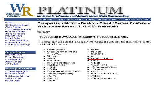 日前,在美國多媒體視頻和通訊領(lǐng)域權(quán)威市場調(diào)研機構(gòu)的 Wainhouse Research 最新發(fā)布了的全球軟件視頻會議廠商的研究報告,北京威速(V2)科技有限公司作為中國領(lǐng)先的軟件視頻會議與解決方案提供商,憑借在軟件視頻會議領(lǐng)域里始終如一的卓越表現(xiàn),以中國唯一廠商的身份入主“全球軟件視頻會議TOP30”榜單。