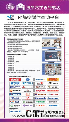 CTI論壇(ctiforum)5月3日消息(記者 張潔): 天行健,君子以自強不息,地勢坤,君子以厚德載物。2011年4月23日,清華大學(xué)迎來百年華誕。在建校百年之際,V2威速聯(lián)合母校----清華大學(xué)百年校慶辦展出了V2網(wǎng)絡(luò)多媒體互動平臺。V2威速眾多旗艦產(chǎn)品之一----V2網(wǎng)絡(luò)多媒體互動平臺始創(chuàng)于1999年清華大學(xué)第二屆“大學(xué)生創(chuàng)業(yè)比賽”。同年,V2威速于清華創(chuàng)業(yè)園創(chuàng)立,經(jīng)過11年的發(fā)展,V2威速已是中國值得信賴的多媒體通訊產(chǎn)品及解決方案供應(yīng)商。
