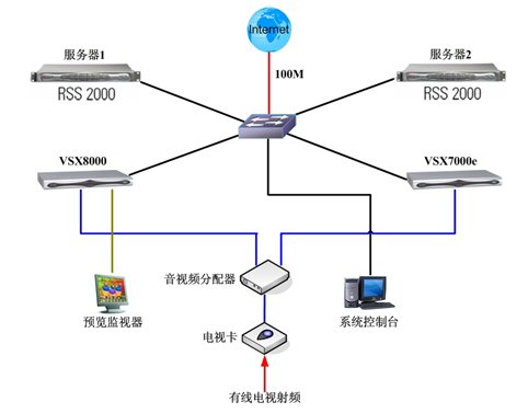 應急備份:此系統(tǒng)中服務器1和服務器2互為備份;VSX8000和VSX7000e互為備份。RSS2000分配公網(wǎng)IP以便用戶通過互聯(lián)網(wǎng)接收直播和點播,兩臺服務器的地址同時發(fā)布在網(wǎng)站上。