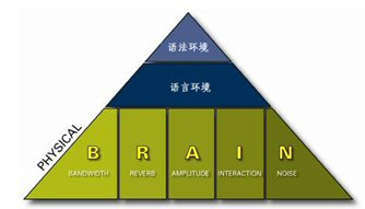 要達(dá)到清晰易懂的談話(huà)效果需要五個(gè)要素的配合:帶寬(Bandwidth)、回響(Reverberation)、振幅(Amplitude)、交互性(Interaction)、噪音水平(Noise)。任何一個(gè)會(huì)議系統(tǒng)的職責(zé)就是自動(dòng)調(diào)節(jié)和平衡這五個(gè)要素,使進(jìn)行交談的雙方都盡可能獲得最佳的聽(tīng)覺(jué)享受。在英文里,我們可以用每個(gè)單詞的首字母來(lái)記憶這五個(gè)特征,即:BRAIN模型。
