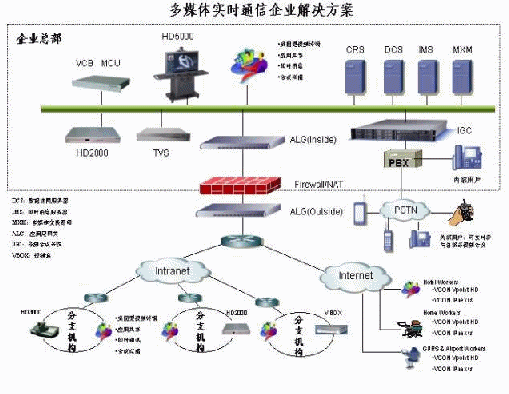 VCON提供了以HD系列的視頻終端產(chǎn)品和以VCB系列的多點控制單元(MCU)產(chǎn)品來構(gòu)建基于IP網(wǎng)絡(luò),采用H.323協(xié)議作為標準協(xié)議的視頻通信解決方案。通常主會場選擇會議室型終端HD5000,該終端在64Kbit/s下就可以實現(xiàn)畫面流暢的動態(tài)雙流;主會場也可以選擇機架式會議終端HD2000,這樣主會場可以選配正裝和吊裝攝像機,拍攝會場不同角度的場景;多點控制單元(MCU)選擇VCB3000,同時可以為領(lǐng)導(dǎo)、個人桌面或者出差用戶單獨配置支持H.323標準的Vpoint HD軟終端,該終端是目前業(yè)界惟一支持H.264、雙流、組播接受以及遠程控制的軟終端產(chǎn)品。