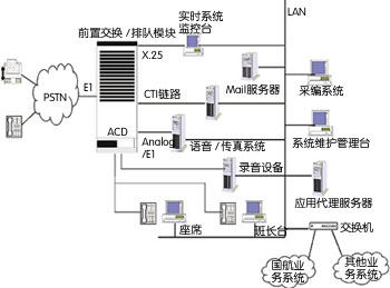 系統(tǒng)方案采用北電的Meridian11交換機作為前置交換/排隊設備, ACD功能內(nèi)置在交換機中。