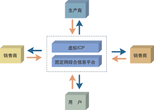 讓我們看看這樣一個應用,以固定網(wǎng)綜合信息平臺為基本支撐平臺,以“虛擬ICP”為業(yè)務承載平臺,包含了銷售商、生產(chǎn)商、供應商、消費用戶,形成了一個初步完整供應鏈系統(tǒng),如圖所示。