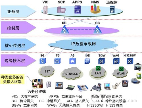 控制層:指Softswitch控制單元,完成呼叫的處理控制、接入?yún)f(xié)議適配、互連互通等綜合控制處理功能,提供全網(wǎng)絡(luò)應(yīng)用支持平臺(tái)。