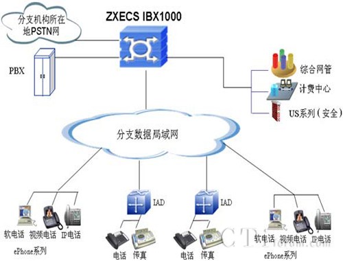 同時(shí)在各分支結(jié)構(gòu),可通過(guò)中興通訊ZXECS IBX1000綜合媒體網(wǎng)關(guān)提供到各地PSTN的語(yǔ)音落地,實(shí)現(xiàn)與各地PSTN的互通。
