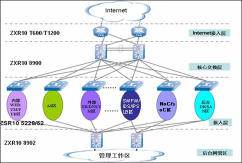 其中Internet接入層為保證線速轉(zhuǎn)發(fā),大容量(路由表、MAC等)和高可靠性,建議采用ZTE的高端核心路由器ZXR10 T600兩臺。核心交換層網(wǎng)絡(luò)的基本要求是:高可擴(kuò)展性、以太網(wǎng)端口密度高,大容量(路由表、MAC等)、高可靠性(全冗余結(jié)構(gòu))、和支持二層/三層VLAN和STP、PVST、802.3ad 、VRRP等等關(guān)鍵技術(shù)。ZTE提供的ZXR10 8900系列萬兆MPLS路由交換機(jī)完全滿足這些要求。它具有多個業(yè)務(wù)插槽,最大提供2880 Gbps的交換容量和2143Mpps的包轉(zhuǎn)發(fā)能力,支持多個萬兆接口或千兆接口,并且能夠提供豐富的業(yè)務(wù)功能。接入層建議采用中興ZXR10 5228/5252全千兆交換機(jī),用高速ASIC交換芯片實現(xiàn)L2和L3數(shù)據(jù)線速轉(zhuǎn)發(fā),提供完備的以太網(wǎng)協(xié)議族支撐和高效的QOS優(yōu)先級機(jī)制,具備靈活多樣的管理手段。ZXR10 5200提供高密度的GE光/電端口和10GE接口,能夠很好的完成數(shù)據(jù)中心中服務(wù)器接入的工作。