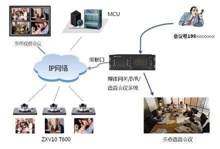 在現(xiàn)有視頻會(huì)議網(wǎng)絡(luò)基礎(chǔ)上新增語(yǔ)音網(wǎng)關(guān)設(shè)備,主要負(fù)責(zé)PSTN、移動(dòng)網(wǎng)和IP網(wǎng)絡(luò)的信令轉(zhuǎn)接、音頻編碼的轉(zhuǎn)換、多點(diǎn)純語(yǔ)音會(huì)議、IVR會(huì)議引導(dǎo)。