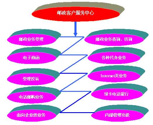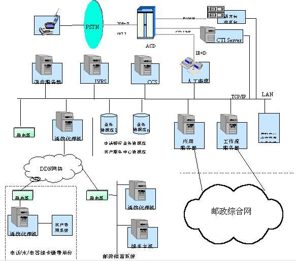 郵政呼叫中心在現(xiàn)有郵政綜合網(wǎng)的基礎(chǔ)上,利用電話服務(wù)廣泛普及,方便快捷的優(yōu)點(diǎn),采用CTI技術(shù),把綜合網(wǎng)提供的諸多并行的多種業(yè)務(wù)無縫集成,為綜合網(wǎng)提供一個集成多種服務(wù)功能為一體的橫向服務(wù)。