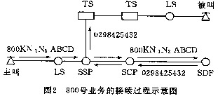 --用戶在撥打800號(hào)業(yè)務(wù)用戶號(hào)碼時(shí),首先由網(wǎng)絡(luò)點(diǎn)上的普通電話交換機(jī)接收,并把800KN1N2ABCD號(hào)碼經(jīng)話路傳送給業(yè)務(wù)交換點(diǎn)SSP,再由SSP將此號(hào)碼經(jīng)No.7信令鏈路送到業(yè)務(wù)控制點(diǎn)SCP,SCP通過在業(yè)務(wù)數(shù)據(jù)庫(kù)SDP中查尋譯碼表將此號(hào)碼翻譯成普通的電話號(hào)碼回送SSP,最后由SSP負(fù)責(zé)完成電路的連接,該過程如圖2所示。