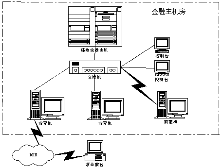 郵政儲蓄金融主機房主要包含金融主機、前置機及網(wǎng)絡(luò)通信設(shè)施。其結(jié)構(gòu)示意圖如下。