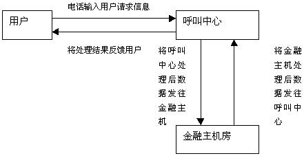 用戶通過撥打電話185連接到185客戶服務中 心,然后根據(jù)客戶服務中心的提示信息利用電話按鍵或語音輸入用戶的請求信息。用戶的請求信息傳送到呼叫中心后,呼叫中心會根據(jù)用戶的請求信息內(nèi)容進行處理,如查詢儲蓄法規(guī)等,然后將處理結(jié)果反饋給用戶,如果牽涉到用戶的帳戶數(shù)據(jù),則呼叫中心將用戶的請求首先進行處理,然后將處理后的信息發(fā)送給金融主機房,由金融主機根據(jù)呼叫中心傳來的數(shù)據(jù)進行帳務處理,然后將處理結(jié)果返回給呼叫中心,呼叫中心再對金融主機房返回的數(shù)據(jù)進行處理成客戶能夠聽到的語音信息,將處理結(jié)果傳給用戶。上述流程是一個單個處理流程,實際上跟用戶進行交互時,一項業(yè)務會有多個往返的處理流程。