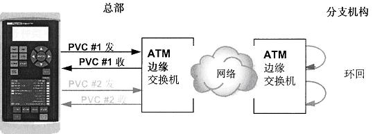 第二,在PVC通道的遠(yuǎn)端設(shè)置物理或虛環(huán)路,這樣單獨(dú)一臺(tái)測試儀可同時(shí)作為流量的發(fā)送者和接收者(見圖2)。 圖2、環(huán)回測試設(shè)置,涉及中心局和遠(yuǎn)端局的PVCs端口