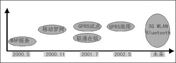 2000年5月,中國移動(dòng)推出了WAP服務(wù),但是由于準(zhǔn)備不足,加之中國移動(dòng)沒有完全轉(zhuǎn)變經(jīng)營理念,使得WAP服務(wù)沒有達(dá)到預(yù)期的發(fā)展目標(biāo)。在吸取WAP服務(wù)的經(jīng)驗(yàn)、教訓(xùn)后,中國移動(dòng)于2000年11月又推出了“移動(dòng)夢(mèng)網(wǎng)”計(jì)劃。在這次的業(yè)務(wù)推廣中,短消息受到了人們的寵愛,發(fā)展到現(xiàn)在,SMS已經(jīng)深入多數(shù)移動(dòng)用戶的心中。2001年7月,中國聯(lián)通也推出了“聯(lián)通在信”與“移動(dòng)夢(mèng)網(wǎng)”進(jìn)行競(jìng)爭(zhēng)(如圖1所示)。與此同時(shí),中國移動(dòng)又開始了GPRS的試點(diǎn)工作,經(jīng)過近一年時(shí)間,“聯(lián)通在信”并沒有取得更好的成績,而中國移動(dòng)的GPRS終于開始正式商用。那么,未來的移動(dòng)數(shù)據(jù)業(yè)務(wù)將依托什么來發(fā)展呢?是3G,還是WLAN、藍(lán)牙?大家只能拭目以待。