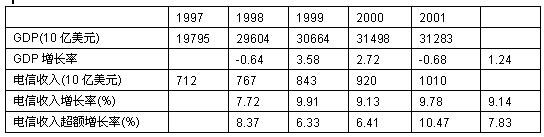 盡管電信運營業(yè)存在投資過度,并導(dǎo)致巨額虧損,但是過去幾年世界電信收入的增長率高于GDP,平均為7.8 3%,顯示出電信運營業(yè)仍呈現(xiàn)出強勢發(fā)展特征。表中的數(shù)據(jù)表明:電信業(yè)仍是經(jīng)濟中最具增長力量的部分。