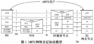 對圖1的簡要描述如下:移動用戶(MS)到RAN左側(cè)部分是無線接入網(wǎng)絡的無線用戶接口(Uu),實現(xiàn)了用戶業(yè)務通過空中無線鏈路接入3G網(wǎng)絡的功能,主要包含物理層(采用WCDMA和TD-CDMA技術(shù))、媒體接入層(MAC)、無線鏈路層(RLC);在RAN內(nèi)部通過協(xié)議中繼(Relay)實現(xiàn)無線鏈路和有線鏈路的對接;在RAN和3G服務節(jié)點之間的接口(Iu)是以ATM技術(shù)為支撐的有線接入段協(xié)議,為支持Internet業(yè)務,采用AAL5適配層協(xié)議,物理層(L1)無明確限定具體傳輸方式;在此之上,透過RAN、MS和3G服務節(jié)點之間存在兩個高層連接,即邏輯聯(lián)絡層(LLC)和更為復雜的第三層實體(L3CE),L3CE是一些以Client/Server方式構(gòu)件的軟件實體,實現(xiàn)諸如無線資源管理、呼叫控制、移動管理等網(wǎng)絡級功能;在3G服務節(jié)點內(nèi)部,為實現(xiàn)到Internet網(wǎng)絡的接入,再作一次協(xié)議中繼,這里,第三層實體的信息映射到通用分組無線服務的隧道協(xié)議GTP(GPRS Tunneling Protocol);3G服務訪問點到3G網(wǎng)關(guān)之間的Gn接口存在清晰的、以TCP/IP協(xié)議為主體的五層對應關(guān)系;構(gòu)建在最上層的是移動用戶到3G網(wǎng)關(guān)的UMTS用戶進程,它通過3G網(wǎng)關(guān)進入Internet骨干網(wǎng),最終實現(xiàn)用戶對Internet的訪問。