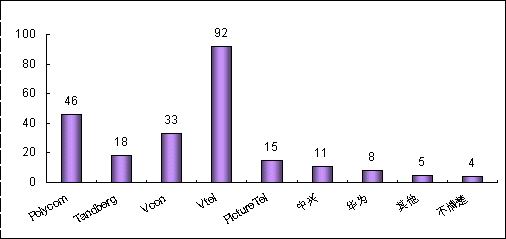 各品牌的認(rèn)知度與其市場(chǎng)銷(xiāo)售情況息息相關(guān)。例如,VTEL是最早進(jìn)入中國(guó)市場(chǎng)的視頻會(huì)議廠商,并在相當(dāng)長(zhǎng)的時(shí)期內(nèi)占據(jù)市場(chǎng)領(lǐng)先地位,取得顯著的品牌認(rèn)知度是有其廣泛用戶(hù)基礎(chǔ)作為支撐的;POLYCOM雖然從1998年才開(kāi)始進(jìn)軍中國(guó)市場(chǎng),但在基于IP的視頻會(huì)議系統(tǒng)的市場(chǎng)爭(zhēng)奪中取得較好的成績(jī);PictureTel已經(jīng)被POLYCOM收購(gòu),品牌認(rèn)知度也相對(duì)較低;而國(guó)內(nèi)品牌中興、華為剛剛起步,也很難達(dá)到較高的認(rèn)知度。