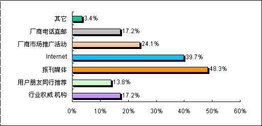 此次調(diào)查顯示,由于視頻會(huì)議系統(tǒng)的行業(yè)性相對(duì)較強(qiáng),目前用戶(hù)在了解視頻終端會(huì)議系統(tǒng)產(chǎn)品時(shí),報(bào)刊媒體、Internet、廠商推廣活動(dòng)、廠商電話(huà)直郵和行業(yè)權(quán)威機(jī)構(gòu)成為主要的信息來(lái)源渠道。值得注意的是網(wǎng)絡(luò)的普及使得更多的用戶(hù)也選擇Internet作為了解信息的重要途徑。但對(duì)各視頻會(huì)議系統(tǒng)的廠商而言,由于客戶(hù)群體相對(duì)龐大,分散區(qū)域較為廣泛,在作好直銷(xiāo)的同時(shí),也應(yīng)該加強(qiáng)渠道的建設(shè),以更及時(shí)和準(zhǔn)確地了解到用戶(hù)采購(gòu)和招標(biāo)的信息,同時(shí)也能夠降低銷(xiāo)售成本。
