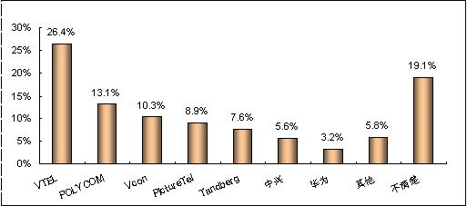 在無(wú)提示情況下,被調(diào)查者首先想到的視頻會(huì)議終端系統(tǒng)的品牌分布情況,即品牌第一提及率指標(biāo),可以反映出各品牌被用戶(hù)認(rèn)知的廣泛程度。賽迪顧問(wèn)調(diào)查數(shù)據(jù)顯示,第一提及率最高的品牌是VTEL,支持率達(dá)到26.4%,比處于第二位的品牌高出13.3個(gè)百分點(diǎn);其次是POLYCOM和Vcon,支持率達(dá)到13.1%和10.3%。(見(jiàn)圖5)