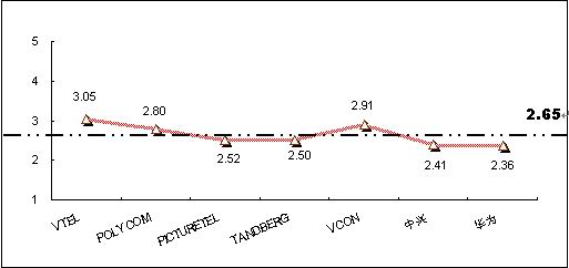 為深入了解和對(duì)比被調(diào)查者對(duì)不同品牌視頻會(huì)議終端系統(tǒng)產(chǎn)品的認(rèn)知程度,本次調(diào)查將被調(diào)查者對(duì)各主要品牌的了解程度劃分為五個(gè)檔次,對(duì)不同的檔次賦予不同的分值,分別為“非常了解(5分)”、“了解(4分)”、“一般(3分)”、“不了解(2分)”、 “非常不了解(0分)”,同時(shí)綜合考慮以購(gòu)買(mǎi)用戶(hù)擁有的品牌分布,借以比較不同品牌在認(rèn)知度上的差異。統(tǒng)計(jì)結(jié)果顯示,目前在中國(guó)市場(chǎng)上,用戶(hù)對(duì)主要視頻會(huì)議終端系統(tǒng)產(chǎn)品品牌的了解程度的平均值為2.65,各品牌認(rèn)知度分值見(jiàn)圖6。其中:VTEL品牌的知名度最高,指標(biāo)值為3.05,超過(guò)了“一般”了解水平;其次為VCON品牌,指標(biāo)值為2.91;POLYCOM的知名度指標(biāo)值為2.8,處于第三位。除VTEL品牌外,其他主要品牌的知名度還都處于低于“一般”了解水平階段,反映出產(chǎn)品的市場(chǎng)認(rèn)知還較低。