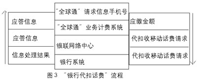“銀行代扣話費(fèi)”方式 對于“由非銀行端發(fā)起,但需銀行代扣收的交易”,其執(zhí)行通過多種接入方式(如手機(jī)短消息、GPRS、客戶服務(wù)中心、自助終端、因特網(wǎng)等)提交信息,內(nèi)容包括“全球通”手機(jī)號(hào)、“神州行”手機(jī)號(hào)、IP電話卡號(hào)、付費(fèi)金額、銀行賬戶、密碼、交易類型等。