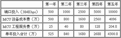 中國網(wǎng)通CNC視訊運(yùn)營網(wǎng)絡(luò)在建網(wǎng)成本上主要考慮四個(gè)部分。一是視訊交換平臺MCU部分,主要用于多點(diǎn)視頻通信;二是視訊運(yùn)營支撐系統(tǒng),包括各種運(yùn)營所必須的軟件(網(wǎng)管、業(yè)務(wù)受理中心、業(yè)務(wù)管理中心)及相應(yīng)的硬件服務(wù)器;三是 H.323 視訊系統(tǒng)的關(guān)鍵組件GK軟件及相應(yīng)硬件服務(wù)器,其容量和個(gè)人視頻通信業(yè)務(wù)的發(fā)展情況息息相關(guān);四是投入資金利息。具體可細(xì)分如下: