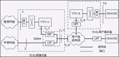VTU-R分別是位于局端和用戶端的VDSL收發(fā)器。業(yè)務(wù)分離器(Splitter,包括HPF和LPF)將同一對電話銅纜上傳輸?shù)腣DSL與窄帶業(yè)務(wù)(或ADSL)