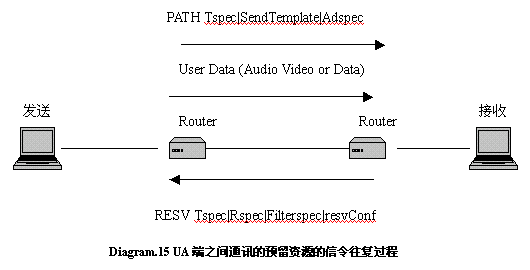 發(fā)送方發(fā)送PATH消息,消息中包含有數(shù)據(jù)業(yè)務(wù)特征,該消息沿所選的路徑傳送,沿途的路由器按照PATH準(zhǔn)備路由資源,接收方接收到PATH消息以后,根據(jù)業(yè)務(wù)特征和所需要的QOS計(jì)算出所需要的資源,回送RESV消息,消息中包含的參數(shù)就包括請求預(yù)留的帶寬,延PATH的原路途返回,沿途的路由器接收到RESV操作后才執(zhí)行資源預(yù)留操作。發(fā)送方接收到RESV消息以后才發(fā)送用戶數(shù)據(jù)。