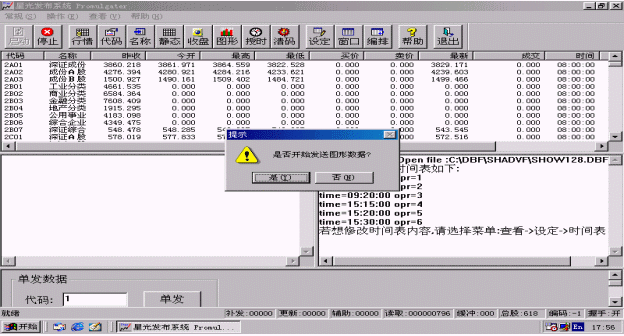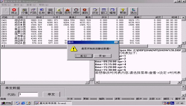 選擇該功能,系統(tǒng)會(huì)自動(dòng)發(fā)送所有指數(shù)和股票的歷史圖形。歷史圖形發(fā)送用時(shí)較長(zhǎng),一般要用一個(gè)小時(shí)左右,它中間的延時(shí)要由信息發(fā)布時(shí)間間隔來(lái)定,信息發(fā)布時(shí)間間隔越大,耗時(shí)越長(zhǎng)。