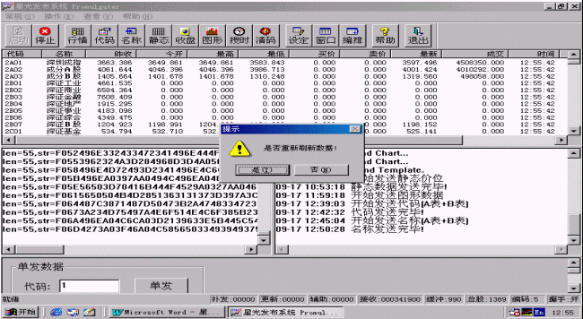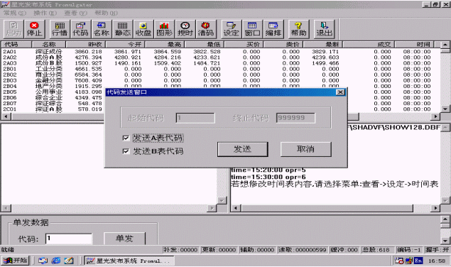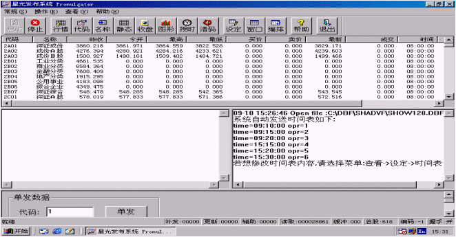 行情也可以單發(fā),只要在進(jìn)行證券信息發(fā)布時(shí)在程序主界面的下方<單發(fā)數(shù)據(jù)>區(qū)輸入要單發(fā)的股票代碼,然后點(diǎn)擊<單發(fā)>按鈕,系統(tǒng)就會(huì)盡快刷新該只股票。