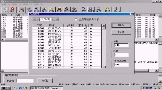 代碼編排是指用戶根據(jù)證券數(shù)據(jù)記錄在數(shù)據(jù)庫(kù)中的位置重新排定股票的索引位置,索引次序可不同于證券代碼的次序,也不是數(shù)據(jù)庫(kù)中記錄的次序,用戶可根據(jù)需要自己設(shè)定,將來(lái)發(fā)布信息時(shí)就按此索引次序(索引號(hào))所指向的股票信息位置取信息進(jìn)行發(fā)布。