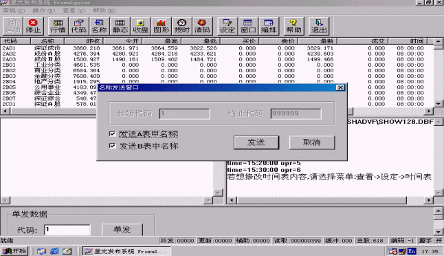 名稱可以只發(fā)A表或者B表,也可以單發(fā)一條或提示輸入一段代碼范圍來(lái)發(fā)送,否則,將發(fā)送所有的證券名稱。