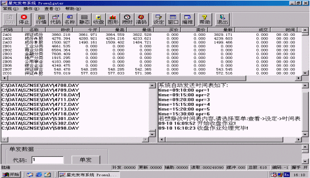 中匯金融信息臺(tái)股票信息發(fā)布系統(tǒng)是中匯金融信息臺(tái)同星傳通信科技(深圳)有限公司共同開(kāi)發(fā)研制的新一代高速股票信息發(fā)布系統(tǒng),它配合中匯金融信息臺(tái)現(xiàn)行使用的星光產(chǎn)SP658、SP659、SP688高速股票機(jī),實(shí)現(xiàn)深、滬兩市證券交易行情的實(shí)時(shí)發(fā)布,刷新速度最快可達(dá)20秒/遍,是目前全國(guó)刷新速度最快的尋呼股票發(fā)布系統(tǒng)之一。該系統(tǒng)兼顧多種信息源輸入格式,配置靈活,采用最為普及和成熟的POCSAG尋呼編碼技術(shù),最大限度地為用戶節(jié)約運(yùn)營(yíng)成本。該發(fā)布系統(tǒng)集信息源接收和信息發(fā)布于一臺(tái)PC機(jī)中,一邊接收?qǐng)D文電視的股票數(shù)據(jù),一邊整理發(fā)送到編碼器,不但節(jié)約了電腦設(shè)備,而且避免了信息上網(wǎng)交換帶來(lái)的延遲,不愧為一種經(jīng)濟(jì)快捷的發(fā)送方式。