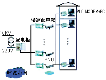 由傳統(tǒng)六層磚結構樓房組成的住宅小區(qū),有小區(qū)住戶較多、用電量大、線路環(huán)境復雜設備老舊的特點。上網率一般小于50%,可采用小區(qū)內LAN寬帶、樓內PLC的方式。在分配到樓宇電力線引入端的公用電表箱處,使用數(shù)據(jù)集中器將寬帶信號數(shù)據(jù)接入電力線,由PLC系統(tǒng)將數(shù)據(jù)送入各戶,整個施工無須改動任何配電線路。此方式也適合塔樓結構的住宅建筑小區(qū)。對于上網率特別高的公共場所/樓層(如辦公樓、賓館、招待所等),可使用寬帶信號到樓層+PLC方式解決。