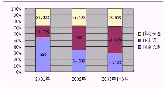(2) IP長途電話業(yè)務由于其資費低,且越來越被市場所接受,其分流的長途電話業(yè)務將進一步增長。