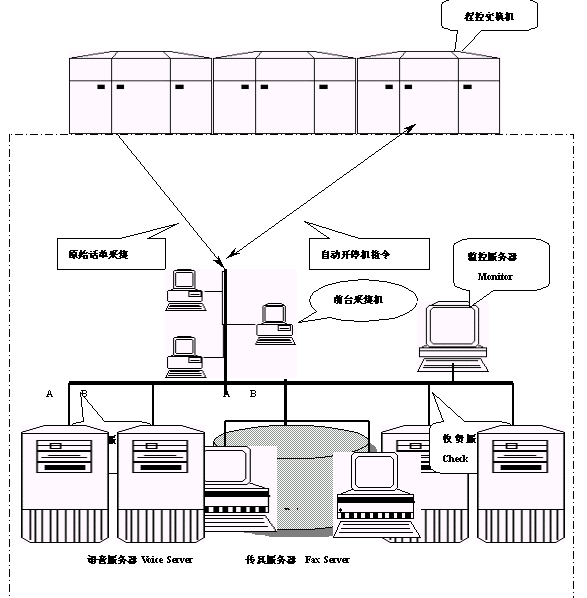 本系統(tǒng)可以分為:話單采集傳輸子系統(tǒng)、計(jì)費(fèi)帳務(wù)處理子系統(tǒng)、收費(fèi)服務(wù)子系統(tǒng)、語(yǔ)音查詢充值子系統(tǒng)、自動(dòng)開停機(jī)子系統(tǒng)和監(jiān)控服務(wù)子系統(tǒng)六個(gè)模塊。