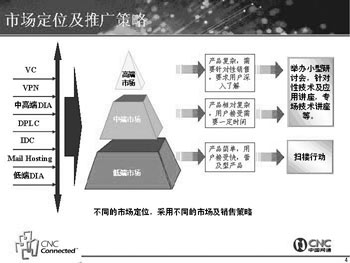 為了打開網(wǎng)通視訊業(yè)務(wù)的局面,網(wǎng)通的推廣方案也非常完備,這位負(fù)責(zé)人向記者出示了一張圖(見左下圖),詳細(xì)地解釋了網(wǎng)通視訊業(yè)務(wù)的市場(chǎng)定位及推廣策略。首先是通過媒體宣傳給客戶以整體印象,力求覆蓋面廣,眾所周知; 接著以直郵形式有針對(duì)性地發(fā)放詳細(xì)單頁資料,深入宣傳;然后以小型研討會(huì)、技術(shù)講座等形式,有針對(duì)性地召集當(dāng)?shù)啬繕?biāo)客戶/潛在用戶,細(xì)論VC市場(chǎng)及產(chǎn)品; 最后是以巡展、樣板客戶案例造聲勢(shì),提高產(chǎn)品形象。