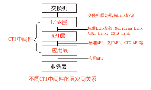 在Link層的基礎(chǔ)上,實(shí)現(xiàn)把標(biāo)準(zhǔn)Link協(xié)議轉(zhuǎn)化為標(biāo)準(zhǔn)的API,如CTC API、TAPI、JTAPI等,為CTI應(yīng)用開(kāi)發(fā)提供一套標(biāo)準(zhǔn)的API,屏蔽了不同交換機(jī)擁有的CTI協(xié)議和CTI接口,使應(yīng)用程序員無(wú)需關(guān)心消息是如何在計(jì)算機(jī)和交換機(jī)之間傳遞,專注于客戶端的應(yīng)用開(kāi)發(fā),實(shí)現(xiàn)應(yīng)用程序與交換機(jī)平臺(tái)無(wú)關(guān)性。