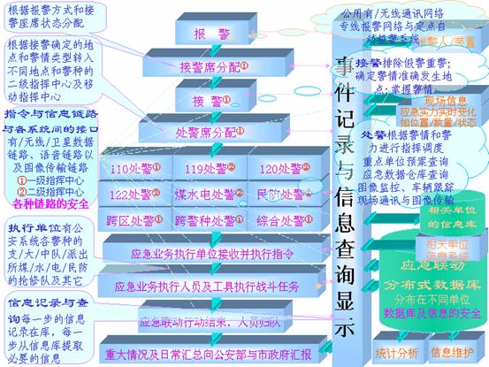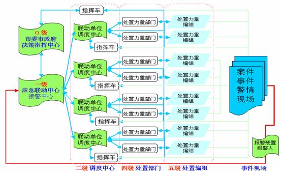 根據(jù)接過來的警情,應(yīng)急聯(lián)動(dòng)系統(tǒng)向處置力量部門發(fā)出指令派出處置力量編組到現(xiàn)場(chǎng),并根據(jù)現(xiàn)場(chǎng)反饋回來的信息,決定是否增援或歸隊(duì)。事件記錄通過局域網(wǎng)被送到相應(yīng)的處警員終端,處警員通過計(jì)算機(jī)輔助調(diào)度系統(tǒng)查詢相關(guān)資料,制定反應(yīng)措施,并向相關(guān)聯(lián)動(dòng)單位發(fā)出具體調(diào)度指令。在緊急事件發(fā)生時(shí),相應(yīng)的電子預(yù)案會(huì)被觸發(fā)啟動(dòng)。如果發(fā)生了重大災(zāi)難,險(xiǎn)情或特殊的事件,則可以啟用城市緊急狀態(tài)指揮室,由首長(zhǎng)進(jìn)行統(tǒng)一指揮。