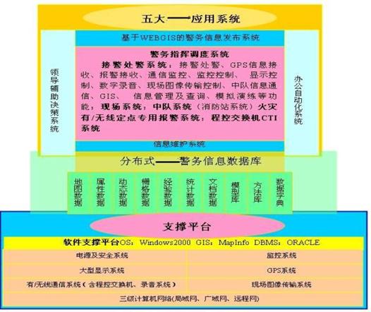 支撐平臺(tái)有計(jì)算機(jī)網(wǎng)絡(luò)系統(tǒng)、監(jiān)控系統(tǒng)、顯示系統(tǒng)、GPS系統(tǒng)、有/無線通信系統(tǒng)、圖像傳輸系統(tǒng)、電源及機(jī)房、軟件支撐平臺(tái)等。其中,計(jì)算機(jī)網(wǎng)絡(luò)系統(tǒng)包括指揮中心、二級(jí)指揮中心與移動(dòng)指揮中心、業(yè)務(wù)執(zhí)行機(jī)構(gòu)(如:應(yīng)急中隊(duì)、派出所等)之間的三級(jí)計(jì)算機(jī)網(wǎng)絡(luò),即指揮中心局域網(wǎng)絡(luò)、業(yè)務(wù)機(jī)關(guān)網(wǎng)絡(luò)、與分支機(jī)關(guān)的廣域網(wǎng)絡(luò)、與移動(dòng)指揮中心的遠(yuǎn)程訪問網(wǎng)絡(luò)。指揮中心與二級(jí)指揮中心、分支機(jī)構(gòu)、移動(dòng)中心之間有語音通信、數(shù)據(jù)通信,指揮中心與移動(dòng)中心有語音通信、數(shù)據(jù)通信(無線)、現(xiàn)場(chǎng)圖像傳輸;指揮中心與公安其它機(jī)構(gòu)通過撥號(hào)網(wǎng)絡(luò)訪問(內(nèi)網(wǎng)),指揮中心與普通老百姓通過撥號(hào)網(wǎng)絡(luò)訪問(外網(wǎng))。