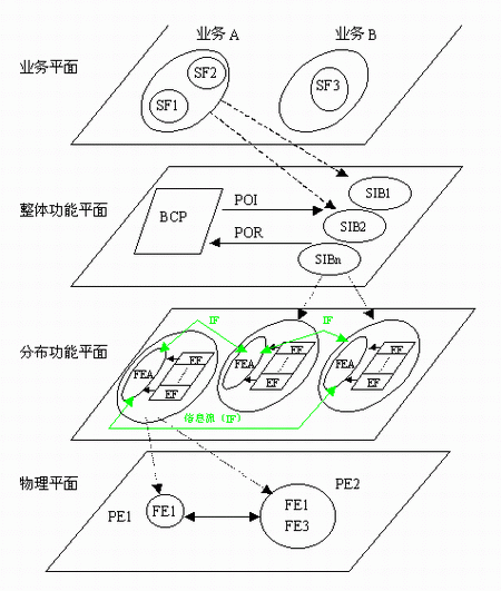在上圖1中, SF—業(yè)務(wù)屬性;BCP—基本呼叫處理;SIB—業(yè)務(wù)無關(guān)構(gòu)筑塊;FE—功能實(shí)體; FEA—功能實(shí)體動作;FE—物理實(shí)體;POI—起始點(diǎn);