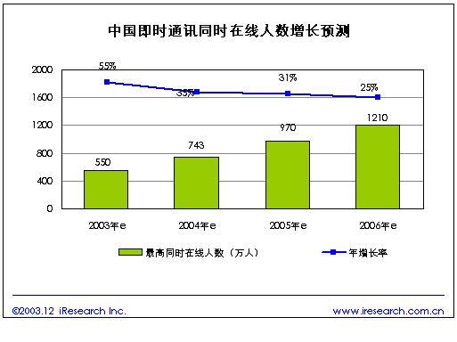 我們預計未來隨著中國上網(wǎng)人口的增長,以及IM軟件的不斷普及,即時通訊在線人數(shù)將保持快速增長。預計2004年國內(nèi)IM最高同時在線人數(shù)有望突破740萬人,到2006年將突破1200萬人同時在線。