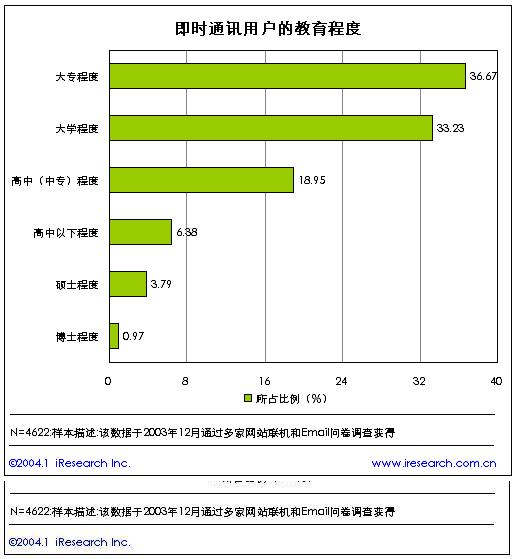 從即時通訊用戶的學歷水平來分析,在目前的即時通訊用戶中,大專以上教育程度的用戶比例達到了75%,占據(jù)了絕對高的比例。顯示出即時通訊用戶的整體教育水平非常高。