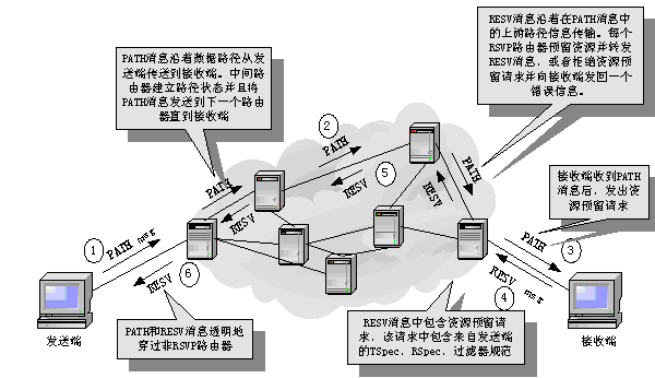 綜合服務(wù)和資源預留協(xié)議IntServ/RSVP:以RSVP信令向網(wǎng)絡(luò)提出業(yè)務(wù)流傳輸規(guī)格(Flowspec),并建立和拆除傳輸路徑上的業(yè)務(wù)流狀態(tài)。主機和路由器節(jié)點建立和保持業(yè)務(wù)流狀態(tài)信息。盡管RSVP經(jīng)常用于單個流,但也用于聚流的資源預留。