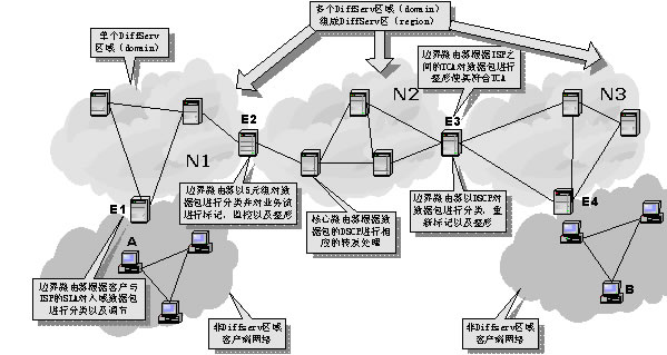 DiffServ區(qū)(region)則是由連續(xù)的DS區(qū)域構(gòu)成。一個DS區(qū)內(nèi)的DS區(qū)域可以支持不同的PHB組,并且各自區(qū)域的DSCP到PHB的映射函數(shù)也可能不相同。在不同的DS區(qū)域之間,必須對SLA和TCA進行調(diào)節(jié),以協(xié)調(diào)彼此之間的服務(wù)語義。這樣,通過在上游DS區(qū)域和下游DS區(qū)域之間建立SLA或TCA,區(qū)分服務(wù)可以擴展到多個DS區(qū)域。