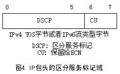 DS標記域定義為IPv4頭部的TOS(Type of Service)字節(jié)或IPv6頭部的流類型(Traffic Class)字節(jié)。如圖4所示。其中DSCP(6bit)即為區(qū)分服務(wù)標記,CU(2bit)在本體系中沒有使用,IETF已將它定義為ECN(Explicit