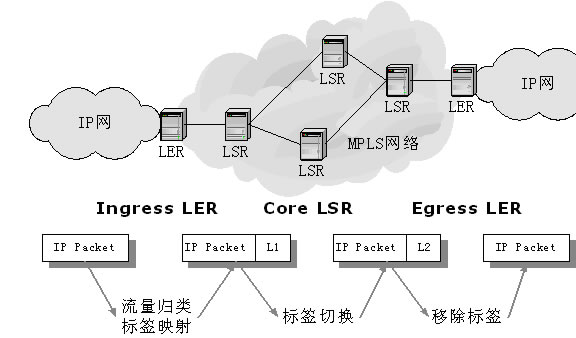標簽邊緣路由器(Lable Edge Router,LER):LER是MPLS網(wǎng)絡(luò)同其他網(wǎng)絡(luò)相連的邊緣設(shè)備,它提供流量分類和標簽的映射(作為Ingress)、標簽的移除功能。