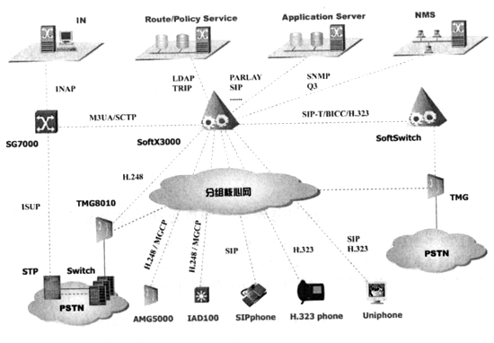 總之,基于IP軟交換的網(wǎng)絡(luò)是一個融合網(wǎng)絡(luò),包括PSTN/ISDN、H.323、ATM/IP等各種網(wǎng)絡(luò)。SIP協(xié)議是NGN多媒體通信協(xié)議,用于軟交換、SIP服務(wù)器和SIP終端之間的通信控制和信息交互,擴展的SIP-T可使SIP消息攜帶ISUP信令;在需要媒體轉(zhuǎn)換的地方可設(shè)置媒體網(wǎng)關(guān),H.248/Megaco為媒體網(wǎng)關(guān)控制器(MGC),用于控制媒體網(wǎng)關(guān),完成媒體轉(zhuǎn)換功能,它并不負(fù)責(zé)呼叫控制功能;H.323也是多媒體通信協(xié)議,它比SIP、H.248/Megaco的發(fā)展歷史更長,是一項復(fù)雜的協(xié)議,升級和擴展性不是很好,SIP+H.248/Megaco可取代H.323,為了與H.323網(wǎng)絡(luò)互通,NGN必須支持該項協(xié)議;SIGTRAN用于解決IP網(wǎng)絡(luò)承載七號信令的問題,它允許七號信令穿過IP網(wǎng)絡(luò)到達(dá)目的地;BICC可使ISUP協(xié)議在不同承載網(wǎng)絡(luò)(ATM、IP、PSTN)上傳送。