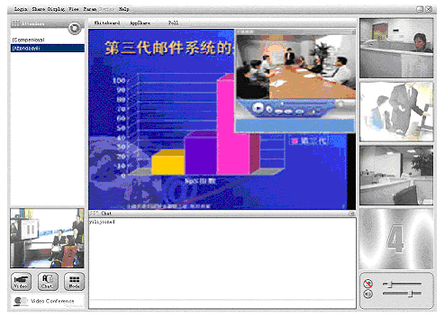 計算機、網(wǎng)絡技術高速發(fā)展的今天,傳統(tǒng)的通訊方式日益滿足不了人們的要求。人們要求能進行遠程會議,開展面對面的交流;同時,在滿足傳統(tǒng)視頻會議音/視頻通信的基本要求之外,現(xiàn)代會議更希望能夠提供更加豐富多樣的會議討論形式和功能,比如:遠程開展季度/年度預算及工作計劃的討論,需要遠程共享PPT等演示文檔和EXCEL等表格,需要共同就某一網(wǎng)上信息開展討論,甚至能夠將開會的通知通過電子郵件和手機短消息的方式傳達到每一個與會者那里。