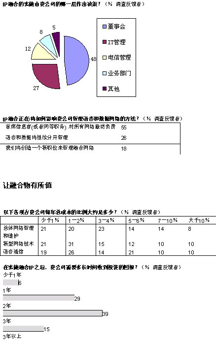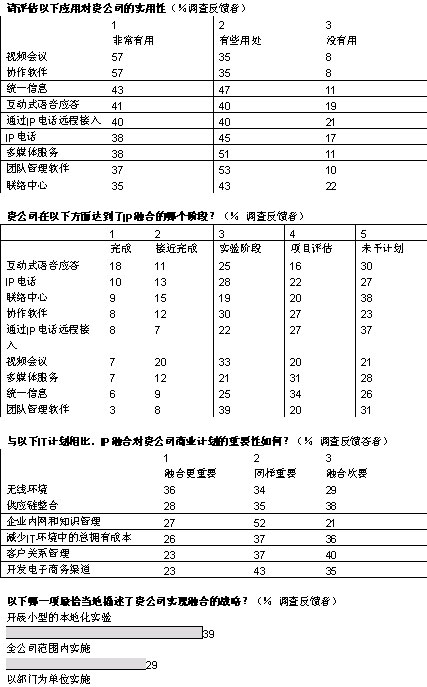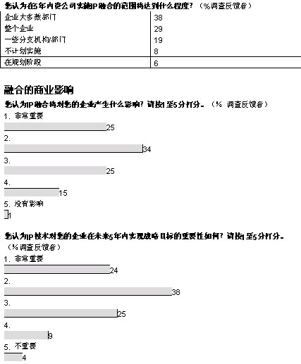 融合網(wǎng)絡(luò)已經(jīng)成為現(xiàn)實(shí)。在經(jīng)濟(jì)學(xué)家信息部展開(kāi)的全球調(diào)查中,103位高級(jí)經(jīng)理中超過(guò)半數(shù)的人投票表示,他們的企業(yè)已經(jīng)開(kāi)始實(shí)施IP網(wǎng)絡(luò)融合,還有26%表示他們將計(jì)劃部署。