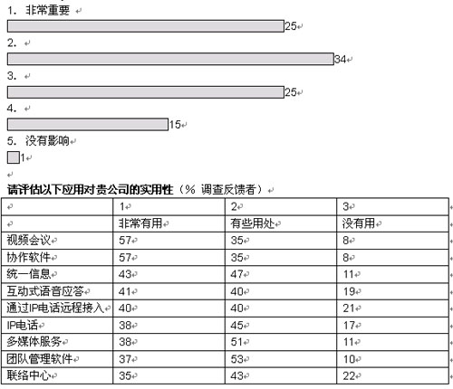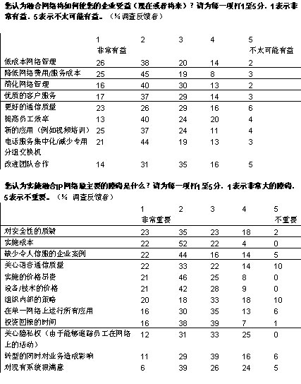 我們調(diào)查的企業(yè)中,有超過(guò)三分之二將在未來(lái)五年內(nèi)實(shí)現(xiàn)大多數(shù)或者所有部門向融合網(wǎng)絡(luò)的轉(zhuǎn)型。大部分企業(yè)采取按部就班的形式在某些特殊部門和業(yè)務(wù)開(kāi)始部署。在融合應(yīng)用中,IP語(yǔ)音電話將在未來(lái)三年內(nèi)吸引大量投資;管理人士期望通過(guò)大幅削減公司內(nèi)部的通話費(fèi)用獲得早期的回報(bào)。在更廣泛的層面上,大多數(shù)管理者預(yù)計(jì),融合網(wǎng)絡(luò)對(duì)其企業(yè)的商業(yè)影響將會(huì)“非常重要”或者“重要”。